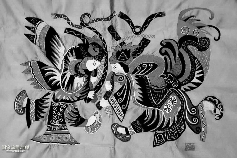 苗族沒(méi)有文字 ,只有語(yǔ)言 ,但他們將信仰圖騰和歷史傳說(shuō)都融在了繁復(fù)的圖案中間。自古以來(lái) ,苗繡作為苗族文化傳承的載體 ,兼有文字和圖像的功能。由于苗族人至今沒(méi)有形成可通讀的文字 ,苗家人文化歷史的傳承 ,主要依靠口口相傳的口頭文學(xué)以及他們的衣裝和衣裝上的刺繡。