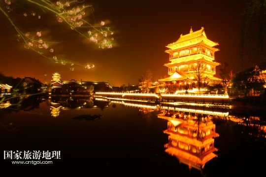 國家旅游地理 山東棗莊4月22日訊 這是夜色下的臺兒莊古城復(fù)興樓(4月8日攝)。1938年春的臺兒莊大戰(zhàn),是抗日戰(zhàn)爭爆發(fā)后中國軍隊在正面戰(zhàn)場取得的一次重大勝利。臺兒莊是世界著名的二戰(zhàn)紀念城市,有著2000多年歷史的臺兒莊古城完好地保存著53處戰(zhàn)爭遺跡。