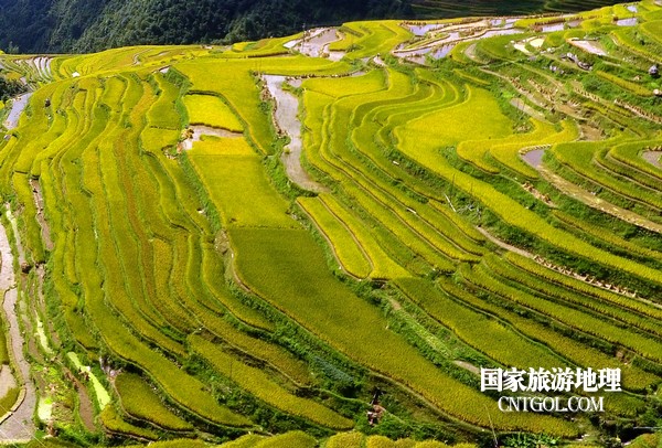 在陽(yáng)光照耀下,層層疊疊的梯田從山腳盤繞到山腰,放眼望去,金燦燦的梯田布滿山間,層層梯田,連綿起伏,拾級(jí)而上,金黃燦爛,小山如螺,大山似塔,高低錯(cuò)落。蜿蜒如春螺、披嵐似云塔,秀美如畫。